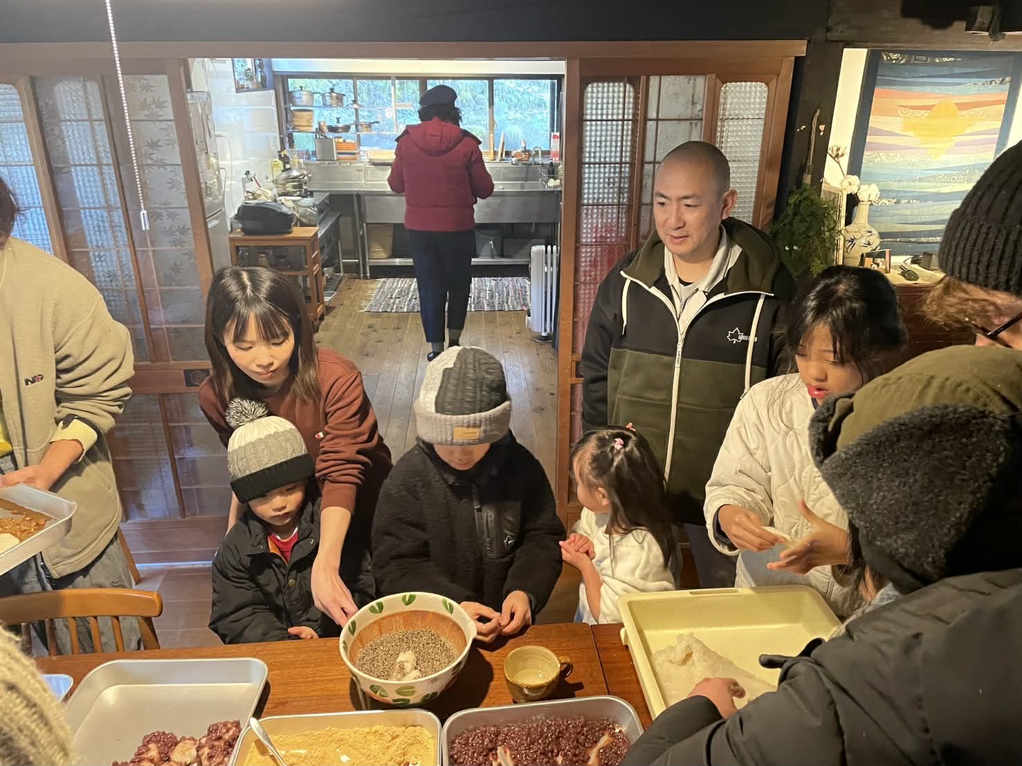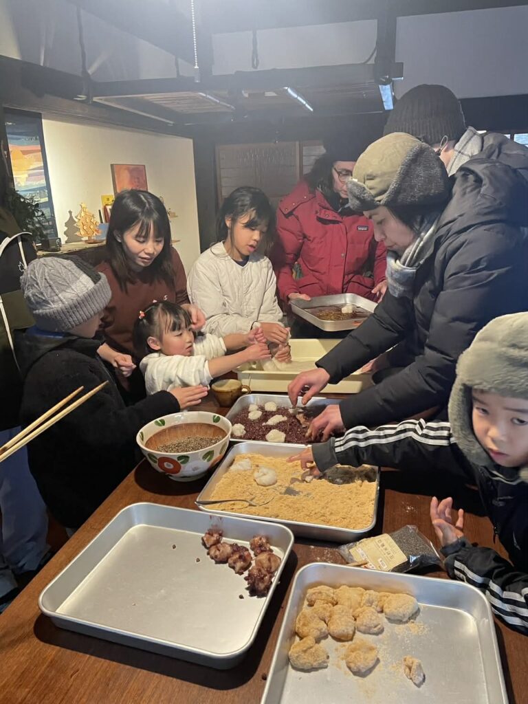 雪が舞い散る中、杵と臼の音が響き渡り、「よいしょ!」という掛け声とともに、笑顔と活気に包まれました。子どもたちは重たい杵に挑戦し、大人たちは優しく見守りながら交代で力を合わせました。つきたてのお餅は、きなこやあんこ、大根おろしなど思い思いの味付けでいただき、心も体も温まるひとときとなりました。