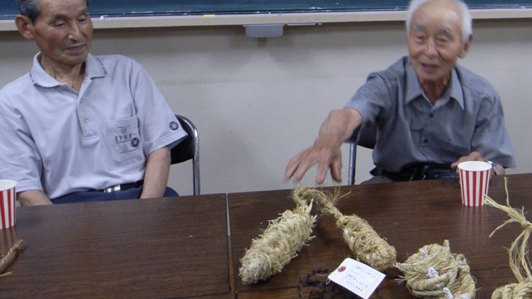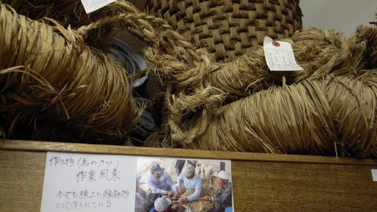 一番印象的だったのは、「ワラを大事にしんとその家は潰れる」という話。昔は一年間でひとり60~70足のゾウリが必要で、履き潰したゾウリもそのまま捨てないで「蚊火」に再利用したりしていた。ワラ細工をするときは「ワラをすぐって」ゴミをとるが、そのゴミも「わら布団」にしていた…などなど。ワラは馬のエサにもなるし、ワラ縄、ムシロ、コモや履物、昔はなんでもワラ!ワラはとても万能な素材だったんですね。