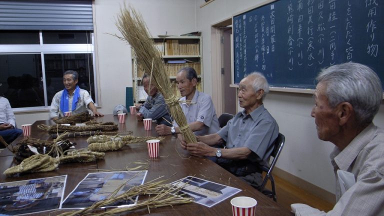 「明宝の昔を知り未来を考える学び塾」をモットーに、これまでにもさまざまな題材で開催されており、第8回目となる今回の題材は「ワラ細工」。地域資源調査を行う明宝ツーネットとしても、地域の達人が4人も集まるとなれば、潜入しないわけにはいきません。同日開催の「明宝ミニバレーボール大会」をご遠慮し、夜の歴史民俗資料館に行ってきました!