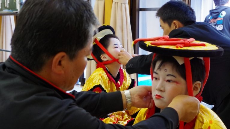 当日は、朝から禰宜(交流センター)で、化粧や衣装の準備(写真3枚)
