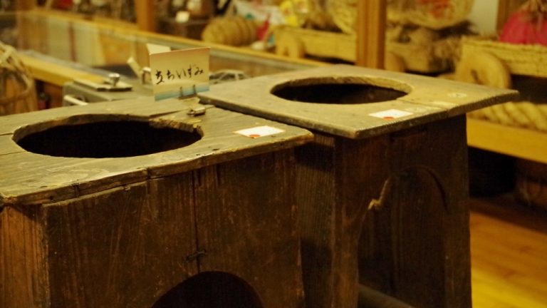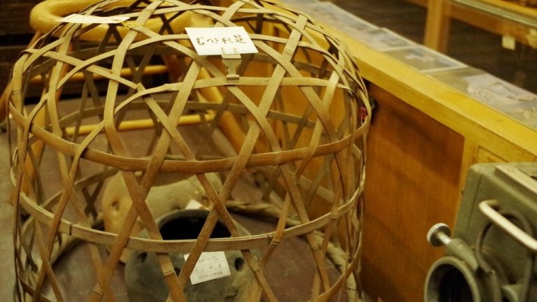 シールが張られている展示品は、有形文化財、もしくは山村用具指定品のため持ち出しができないということで、展示したい民具にシールがあるかどうかを確認して回ります。